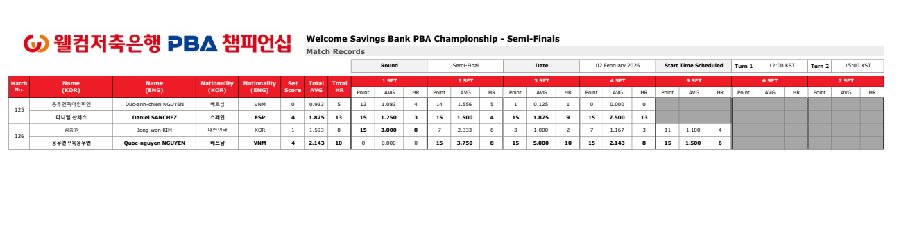 이 경기에서 평균 애버리지는 2.143, 하이런은 10점이었습니다. 한 번 흐름을 잡으면 짧은 이닝에 점수를 몰아치는 장면이 인상적이었고, 결승 진출이 결코 우연이 아니라는 점을 보여줬습니다.