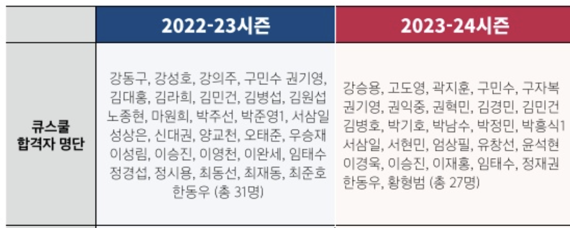 2022~2023시즌 역시 강동구, 강성호, 구민수, 김민건, 노종현, 마원희, 박준영, 서삼일, 이승진, 최재동, 최준호, 한동우 등 총 31명이 Q스쿨을 통과하며 다시 무대로 돌아왔습니다.