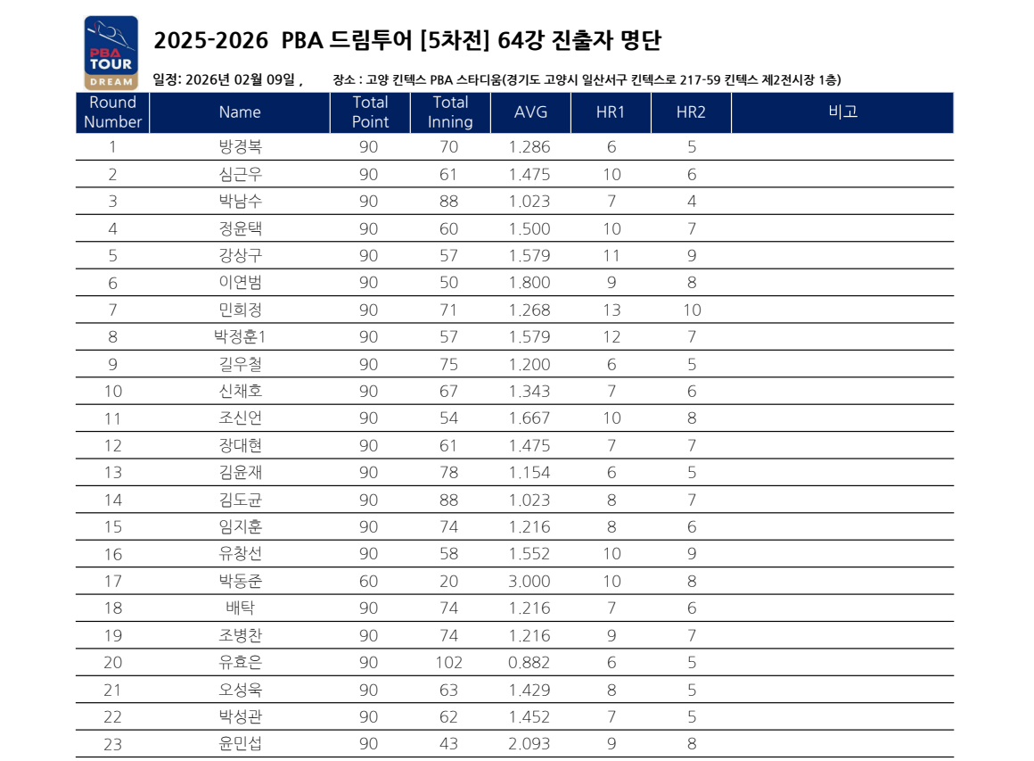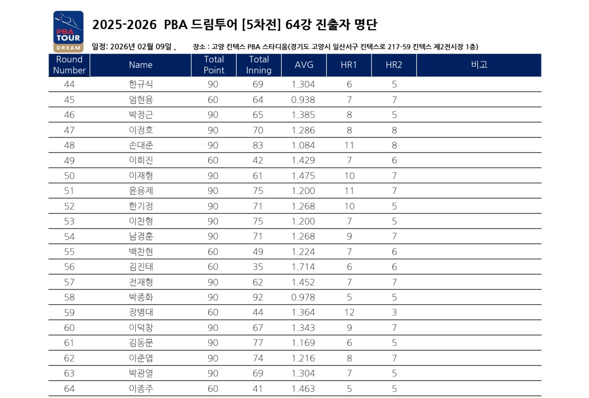 PBA 드림투어 5차전 64강 대진표, 누가 32강에 진출할까?