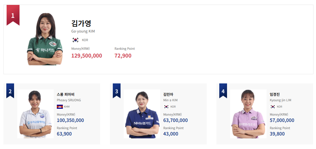 그 뒤를 스롱 피아비, 김민아, 임경진, 이미래 선수가 잇고 있습니다. 중위권에는 강지은, 김상아, 김예은, 정수빈, 김보미 선수가 포진해 있어 언제든 반전이 가능한 구도입니다.