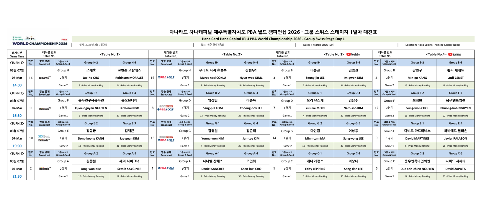 PBA 월드챔피언십 2026 3월 7일 1일차 대진표·경기시간 한눈에 보기