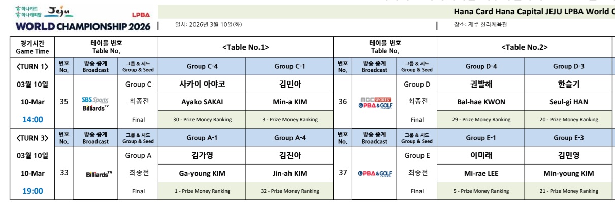 | LPBA 월드챔피언십 2026 2일차 대진표·경기시간 총정리 (3월 8일) (0) | 2026.03.07 |
