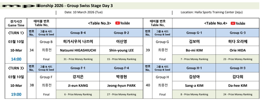 3일차 경기는 3월 10일 두 개 턴으로 나뉘어 진행됩니다.