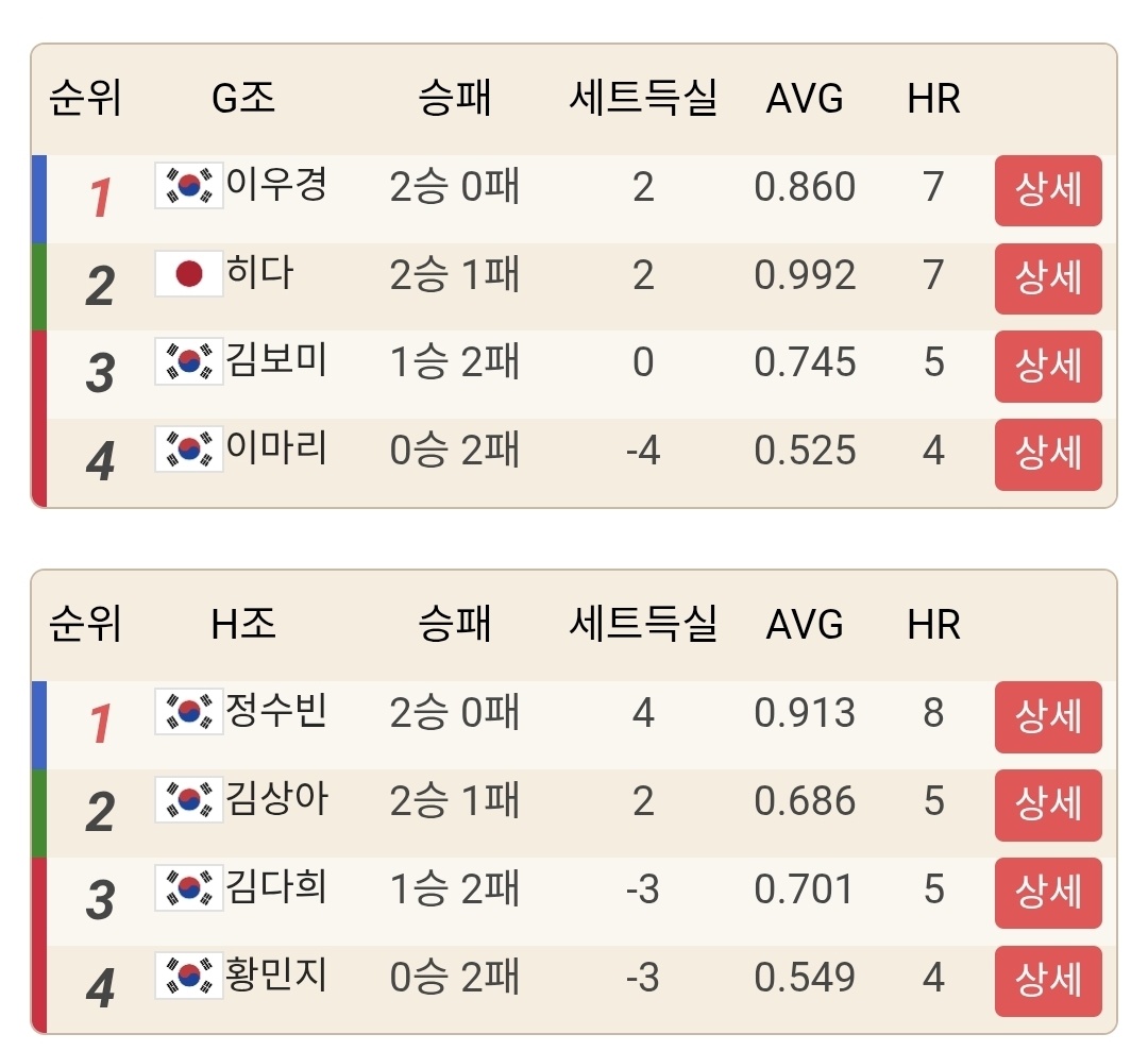 김가영은 조 2위였지만 AVG 1.183, HR 9로 여전히 높은 공격력을 보여줬고, 김민아도 조 2위이면서 세트 득실 +5, AVG 0.980으로 내용이 좋았습니다.