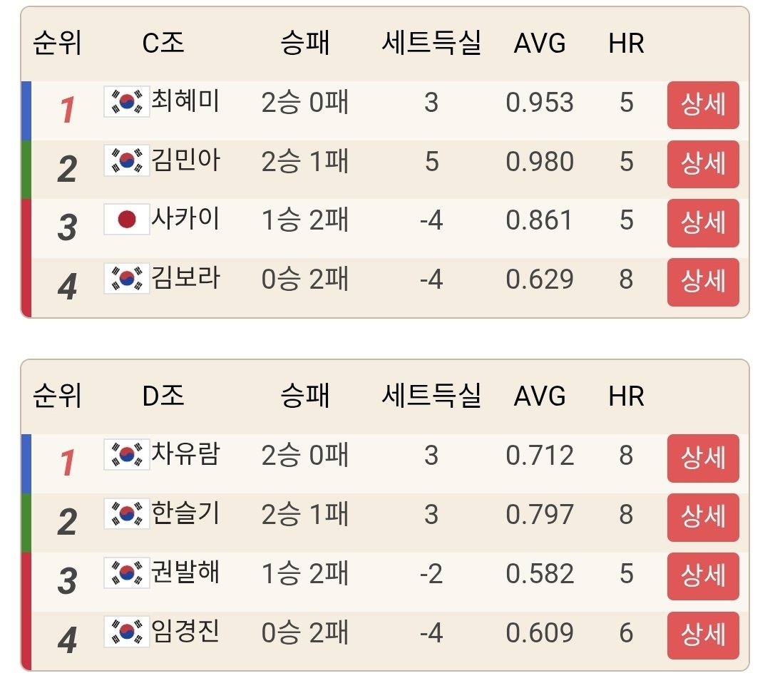 특히 스롱 피아비, 사카이 아야코, 김보미처럼 이름값과 기대치를 생각하면 아쉬움이 큰 결과도 보입니다. 스위스 스테이지는 한 번 흐름이 꺾이면 회복이 쉽지 않다는 점이 이번에도 확인됐습니다.