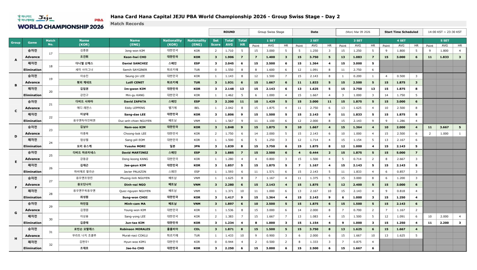 김가영은 조 2위였지만 AVG 1.183, HR 9로 여전히 높은 공격력을 보여줬고, 김민아도 조 2위이면서 세트 득실 +5, AVG 0.980으로 내용이 좋았습니다.