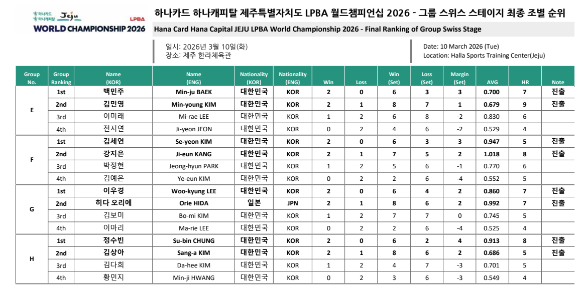 LPBA 월드챔피언십 2026 최종 조별 순위와 16강 진출자