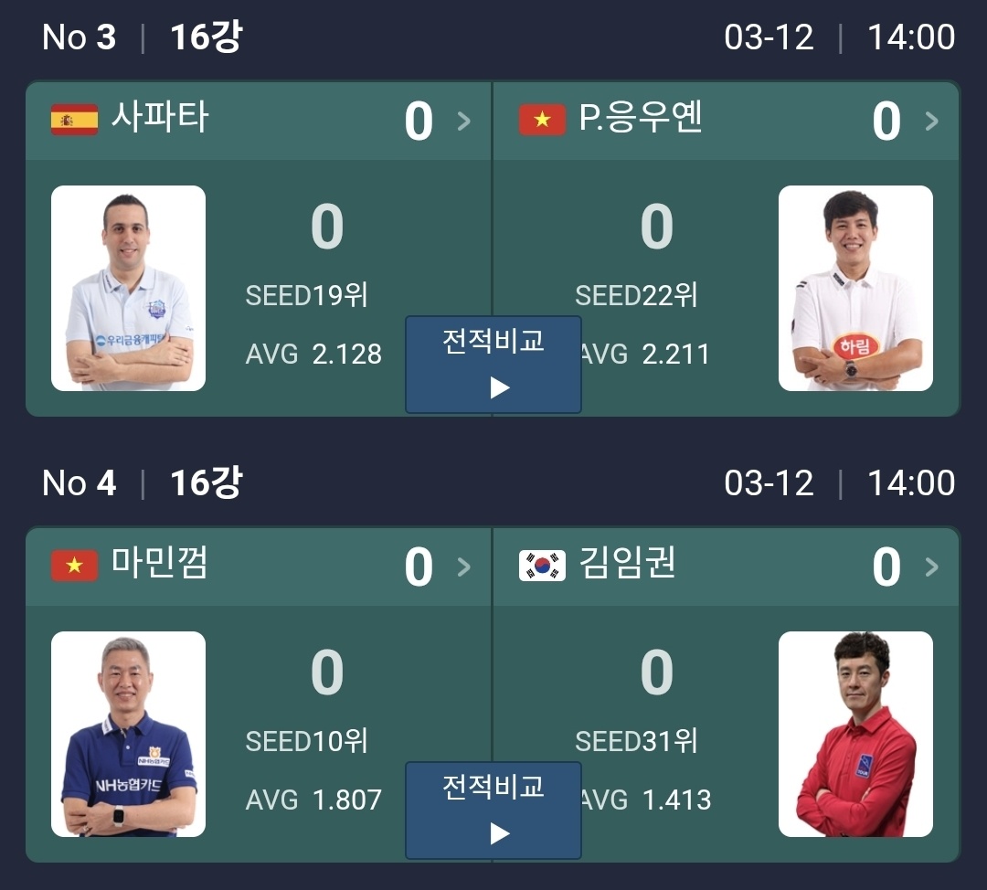 오후 2시에는 다비드 사파타와 P.응우옌, 마민껌과 김임권 경기가 열립니다. 사파타와 P.응우옌 경기는 수치상 가장 화끈한 카드로 볼 만합니다. 예선 평균만 놓고 봐도 두 선수 모두 공격 흐름이 좋아 초반부터 빠른 템포가 나올 가능성이 큽니다.