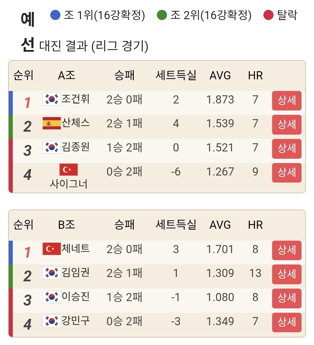 특히 다비드 사파타는 AVG 2.128, 김남수는 AVG 2.032를 기록하며 강한 인상을 남겼습니다. 조 1위는 단순히 먼저 올라갔다는 의미를 넘습니다. 예선 내내 흔들림이 적었고, 중요한 순간 세트 집중력이 살아 있었다는 뜻으로 읽을 수 있습니다.