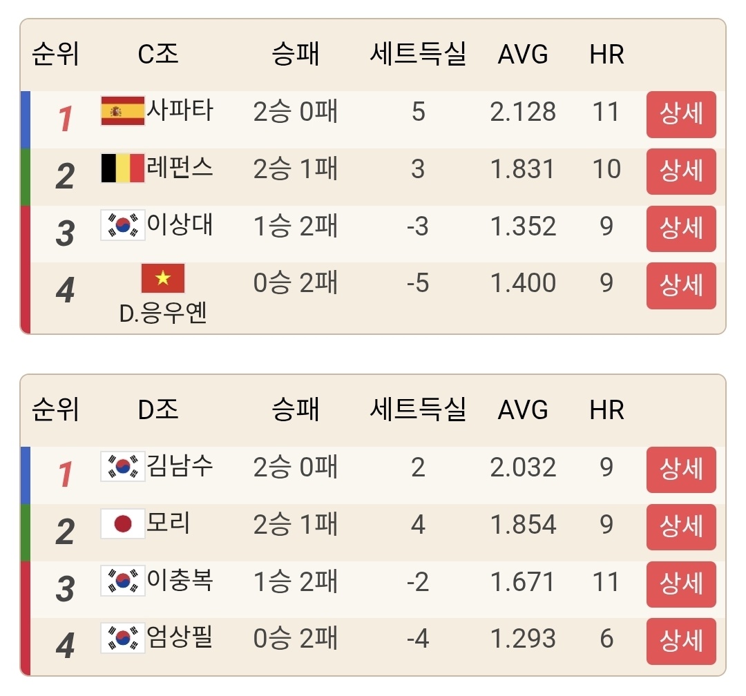 특히 다비드 사파타는 AVG 2.128, 김남수는 AVG 2.032를 기록하며 강한 인상을 남겼습니다. 조 1위는 단순히 먼저 올라갔다는 의미를 넘습니다. 예선 내내 흔들림이 적었고, 중요한 순간 세트 집중력이 살아 있었다는 뜻으로 읽을 수 있습니다.