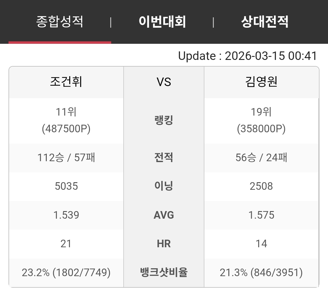 종합성적 기준으로 조건휘는 랭킹 11위, 112승 57패, 애버리지 1.539, 하이런 21, 뱅크샷 비율 23.2%를 기록 중입니다. 김영원은 랭킹 19위, 56승 24패, 애버리지 1.575, 하이런 14, 뱅크샷 비율 21.3%입니다.