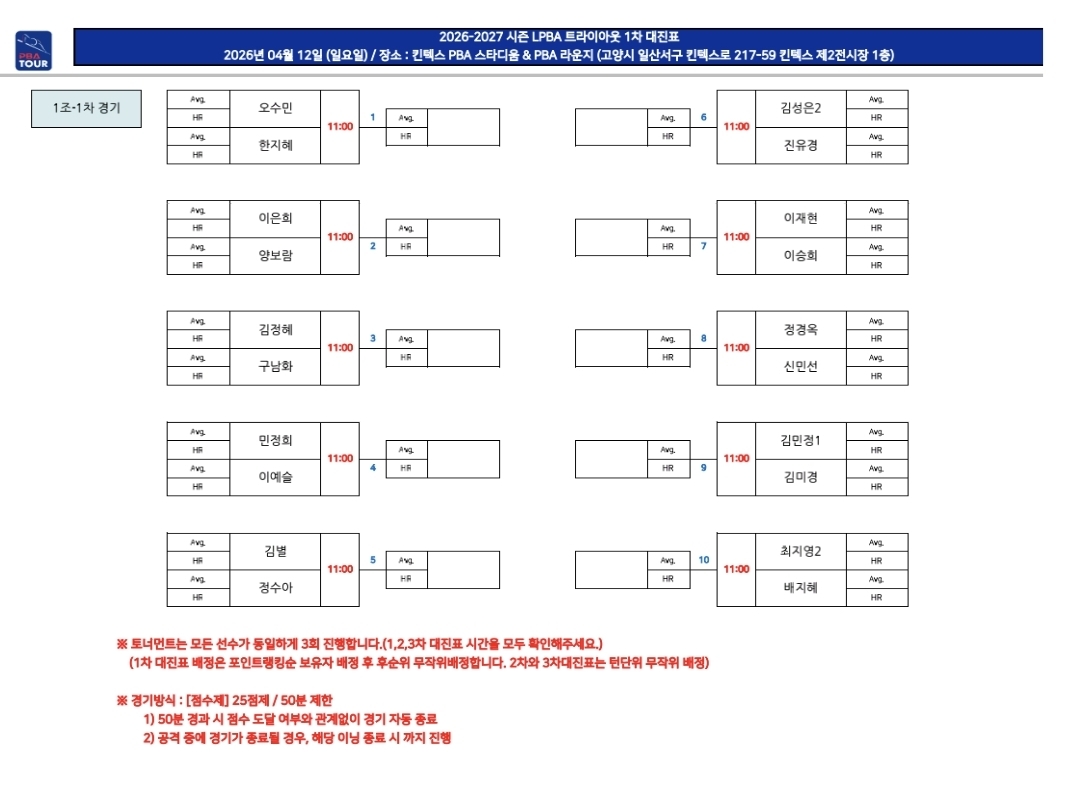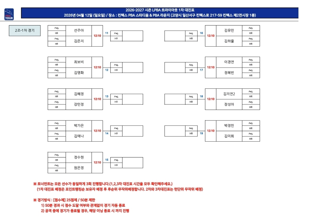 2026 LPBA 트라이아웃은 4월 12일 고양 킨텍스 PBA 스타디움과 PBA 라운지에서 열리며, 25점제와 50분 시간제 기준으로 총 3번의 토너먼트를 치르는 방식입니다. 중요한 점은 승패만으로 끝나는 구조가 아니라 3회 경기 내용을 종합 평가해 최종 선발을 결정한다는 점입니다.