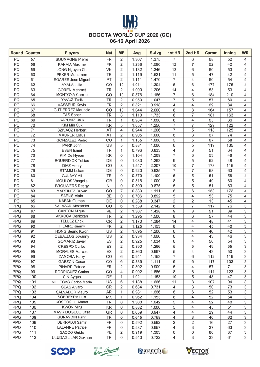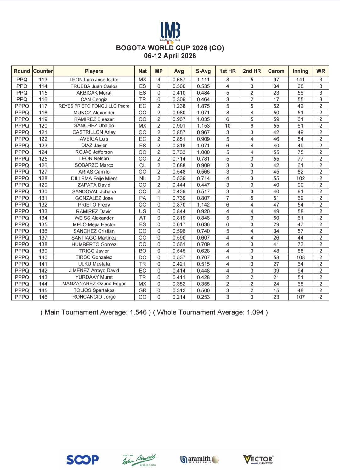 2026 보고타 3쿠션 월드컵 결산, 조명우 정상 등극과 선수별 최종 성적