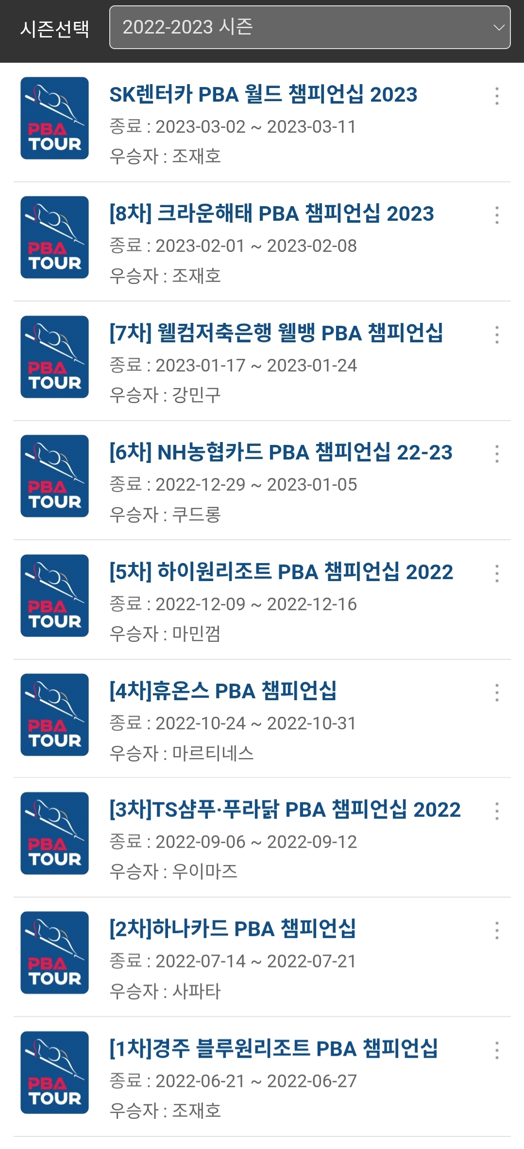 2022-2023시즌은 조재호가 1차, 8차, 월드챔피언십을 가져가며 존재감을 크게 키운 해였습니다. 사파타, 우이마즈, 마르티네스, 마민캄, 쿠드롱, 강민구도 각각 우승을 기록했습니다. 2023-2024시즌에는 사이그너, 쿠드롱, 팔라손, 마르티네스, 최성원, 최원준, 조재호, 조건휘, 초클루가 우승하면서 우승자 분산이 더 뚜렷해졌습니다.