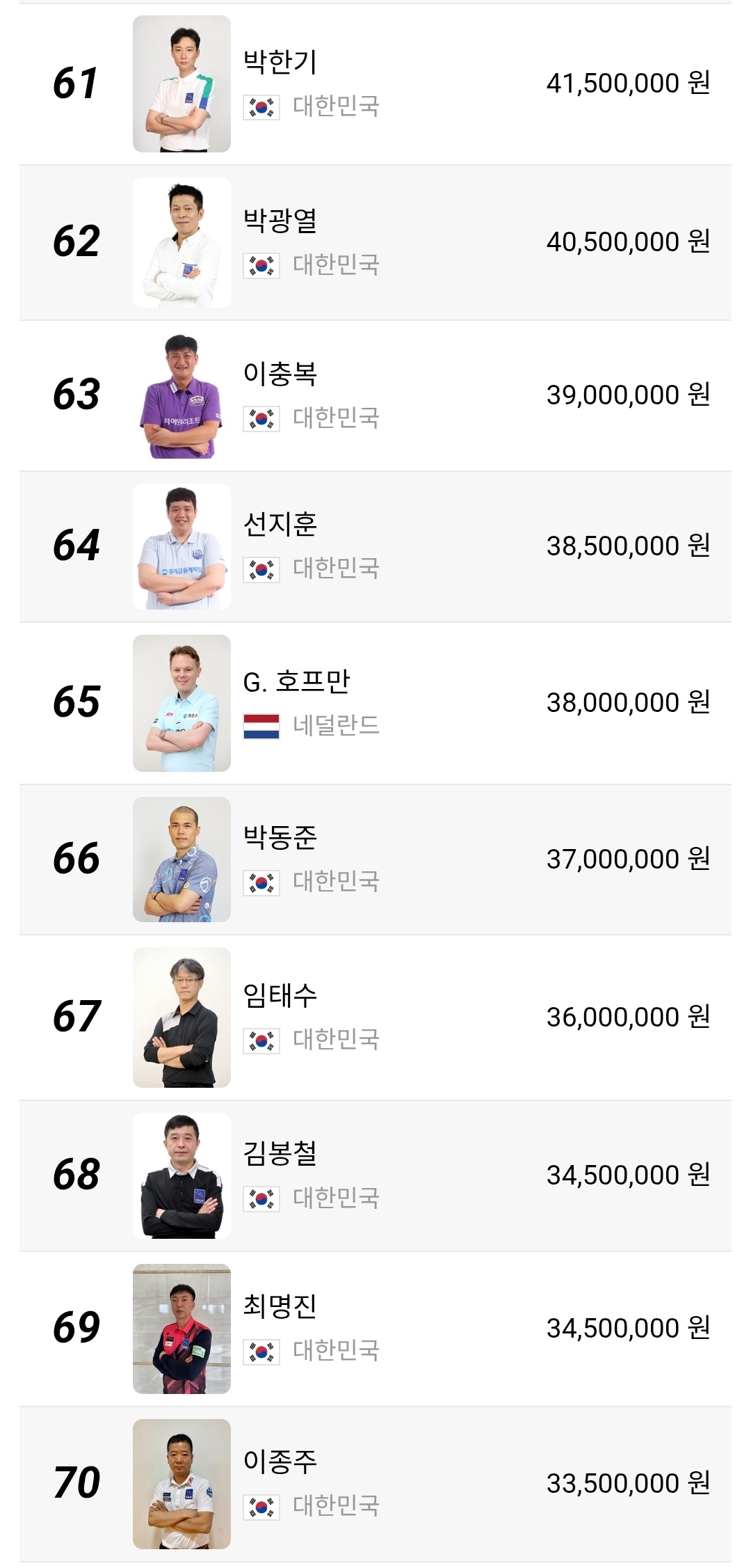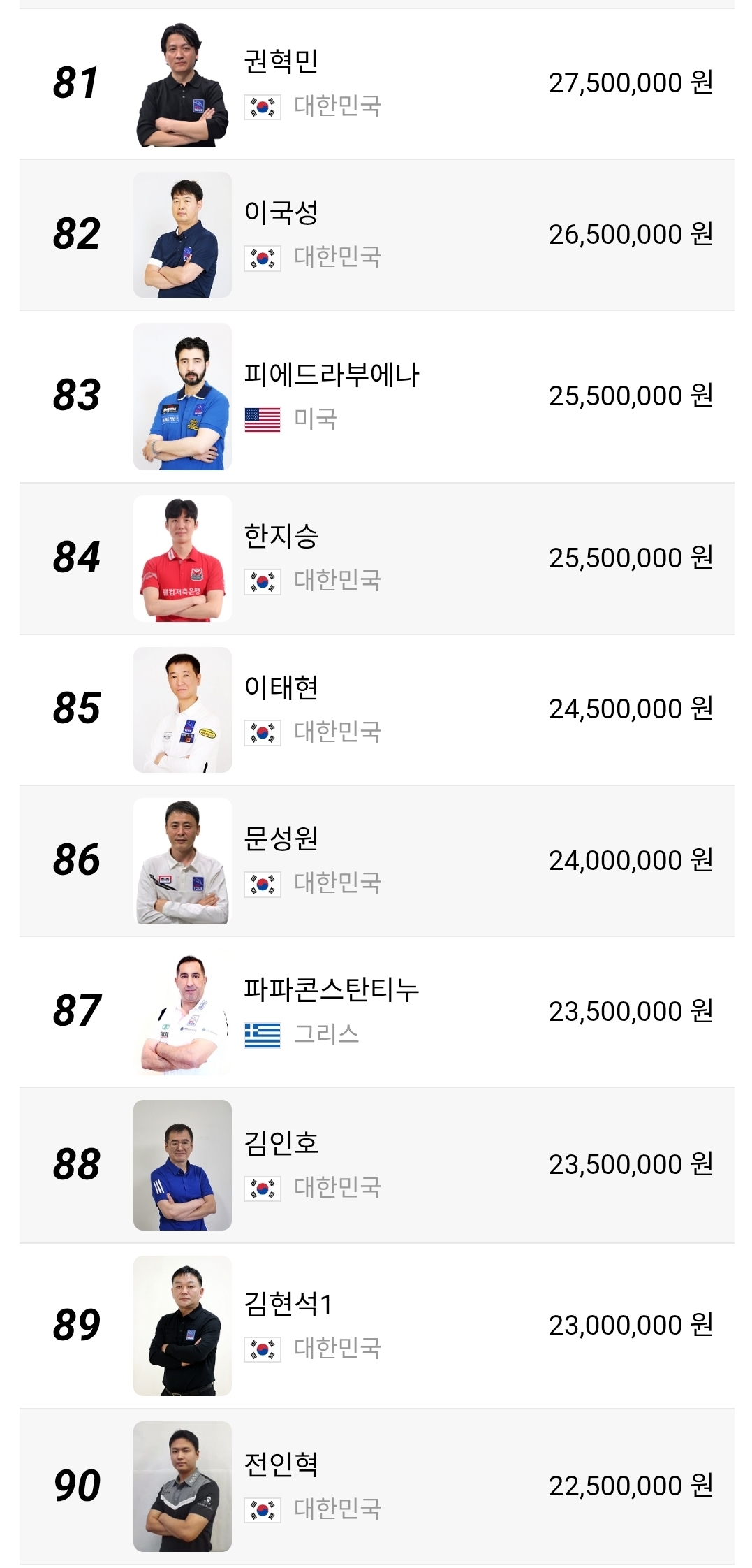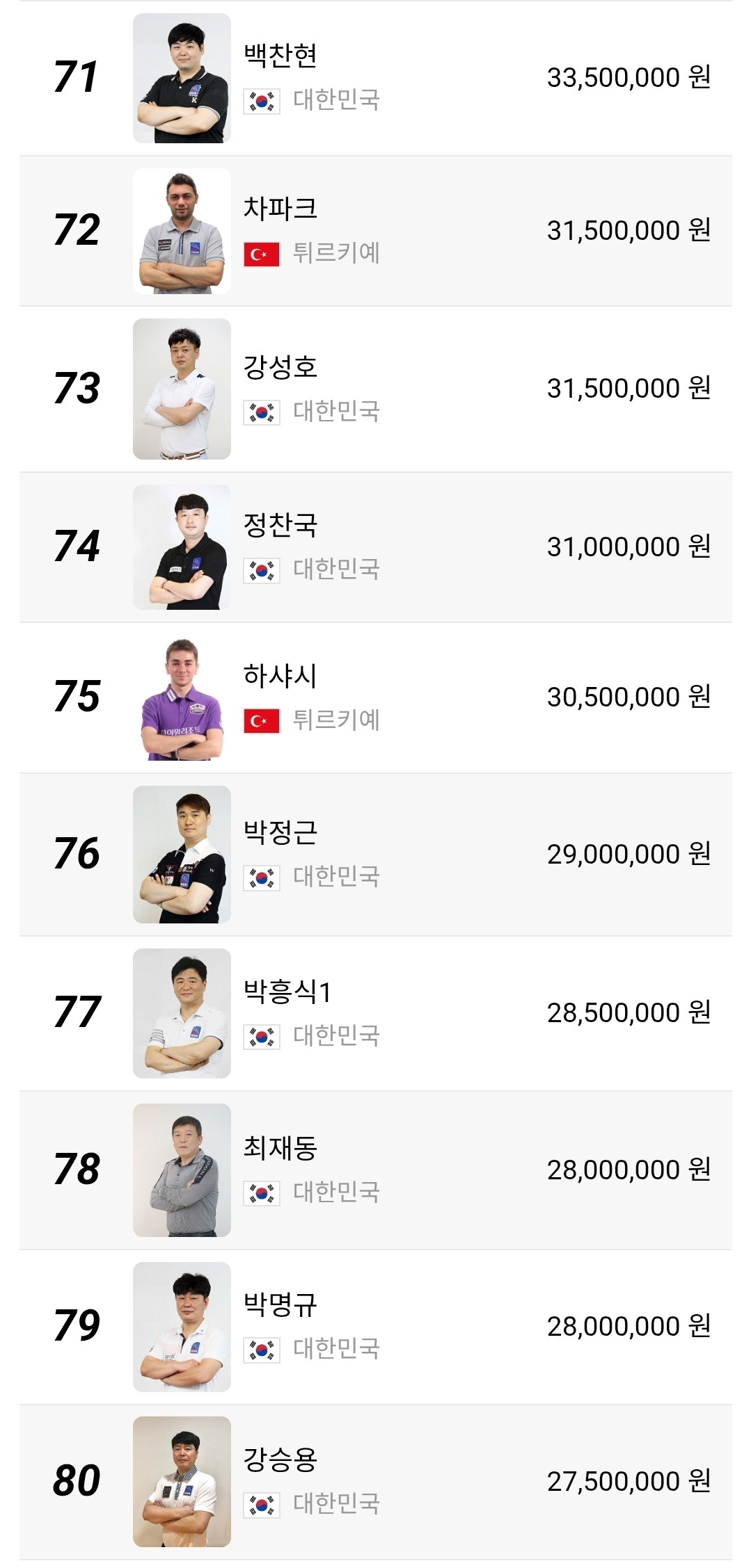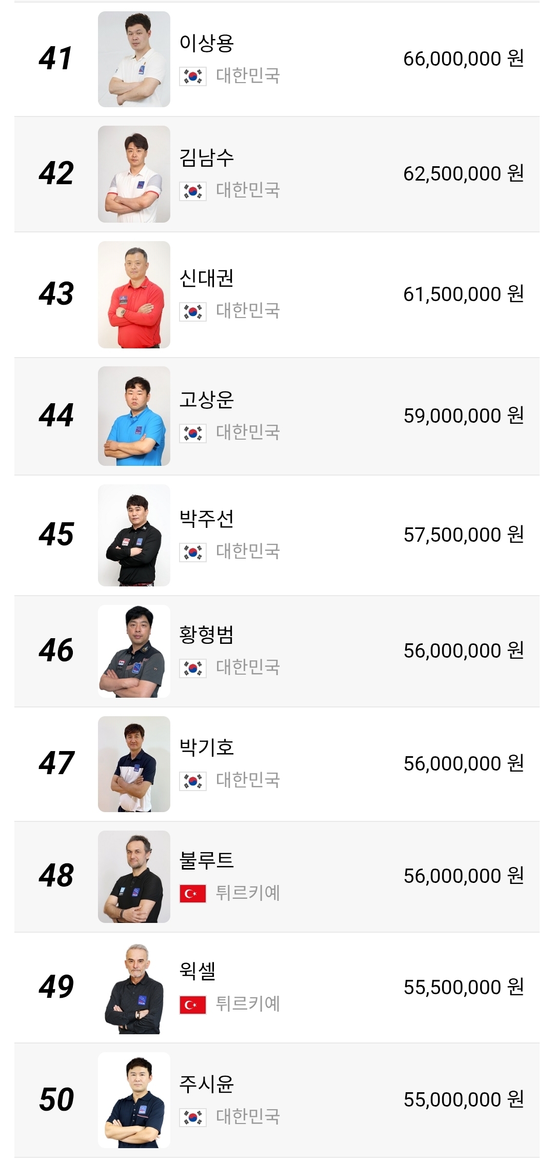 51위부터 100위 구간은 더 민감합니다. 상금 차이가 크지 않아 한 대회에서 8강이나 4강만 기록해도 순위가 크게 달라질 수 있습니다. 장남국, 박명규, 정찬국, 박홍식1, 박승희2 같은 선수들은 물론이고 외국 선수들까지 섞여 있어 경쟁 구도가 꽤 복잡합니다. 이 구간은 단순한 하위권이 아니라 다음 시즌 잔류 경쟁의 출발선이라고 보는 편이 맞습니다.