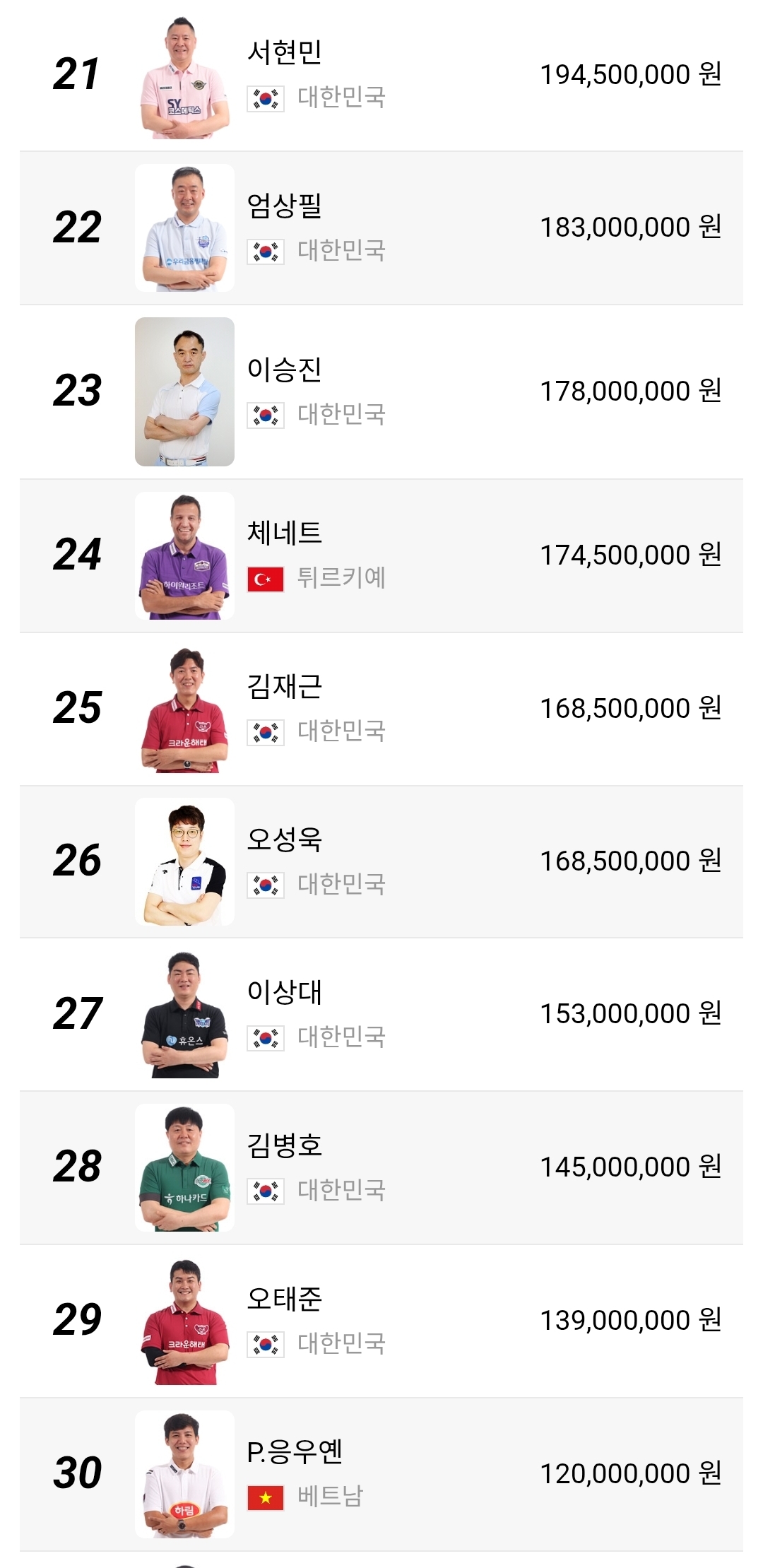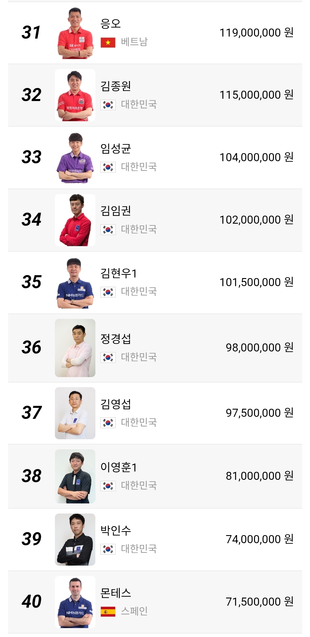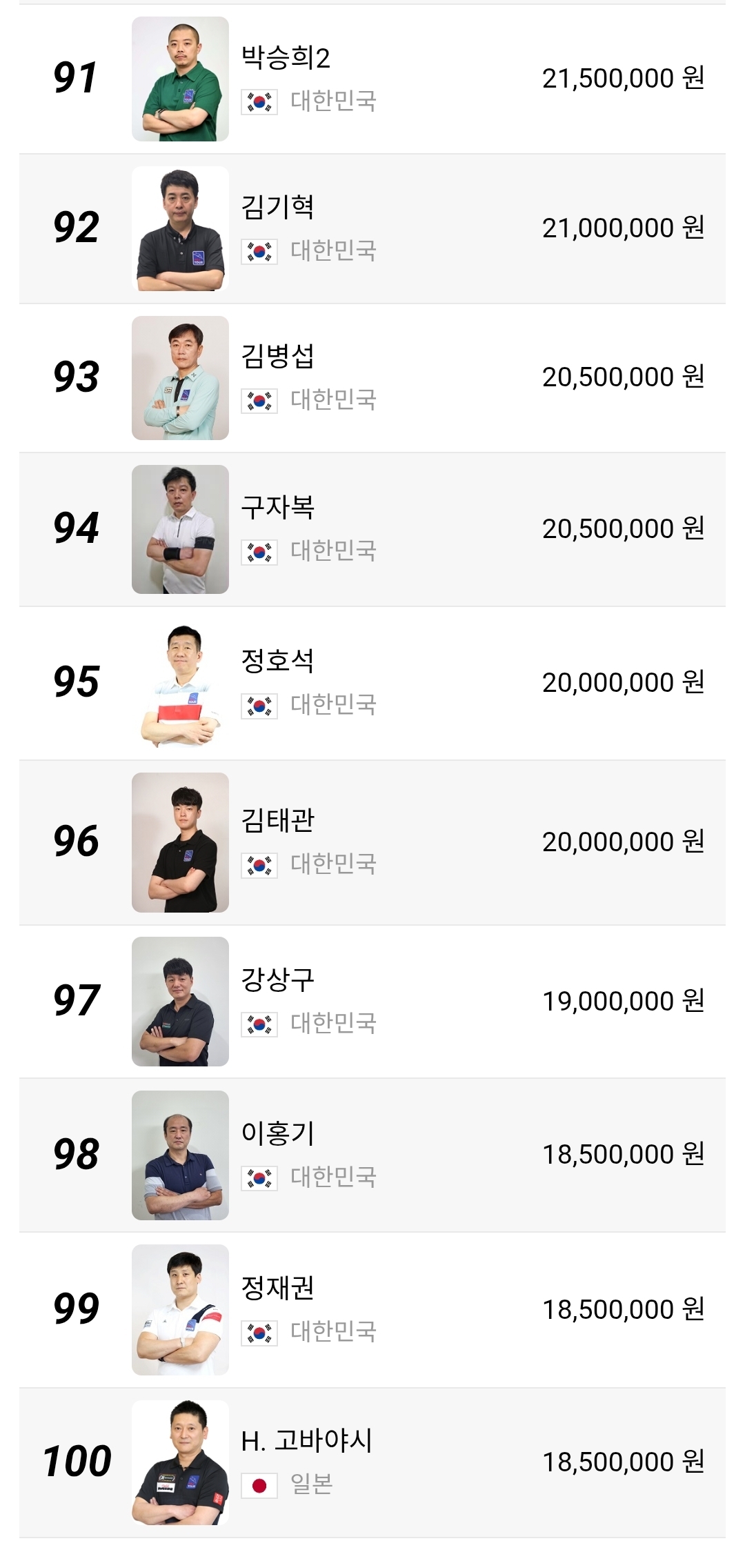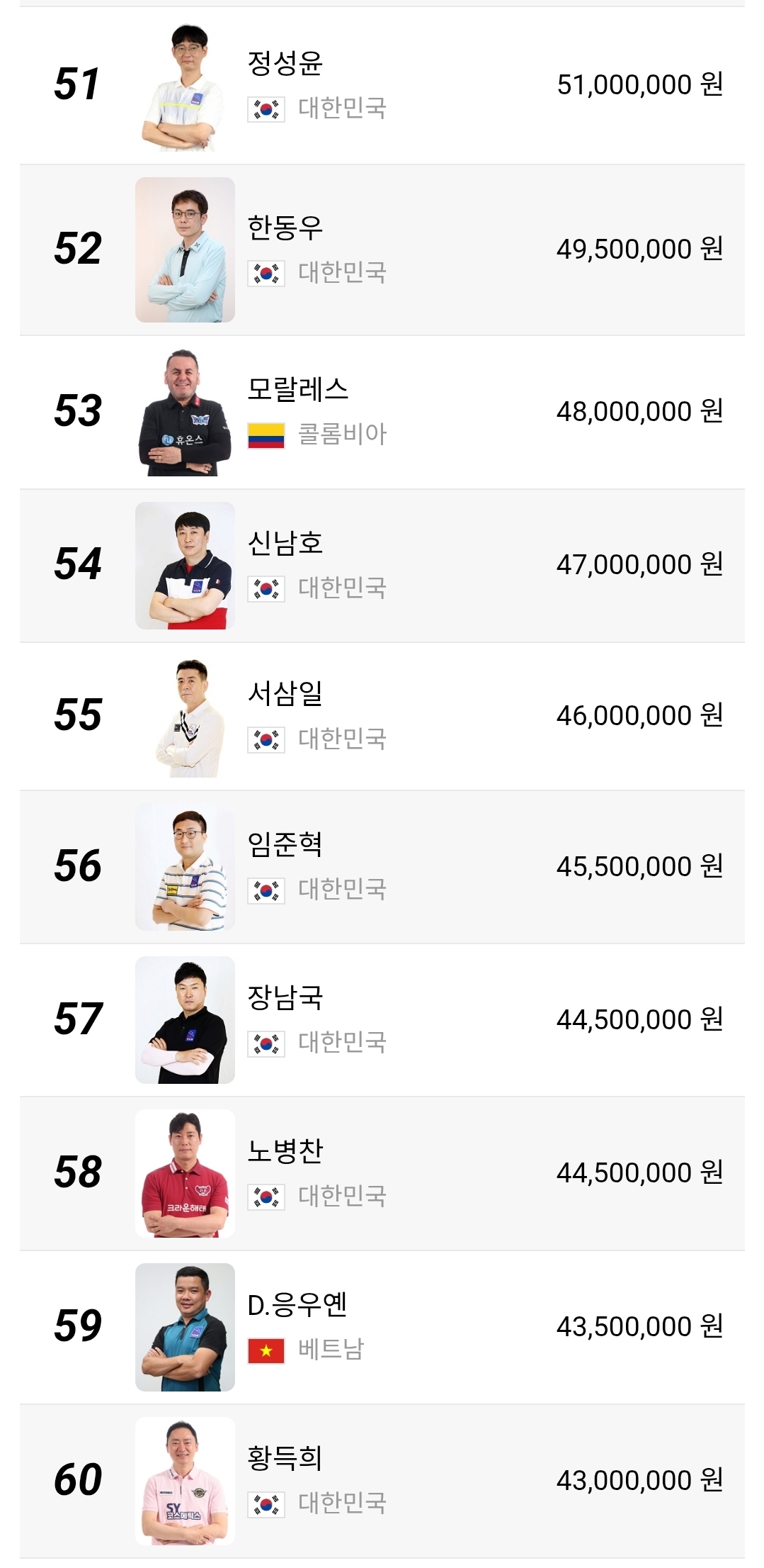 51위부터 100위 구간은 더 민감합니다. 상금 차이가 크지 않아 한 대회에서 8강이나 4강만 기록해도 순위가 크게 달라질 수 있습니다. 장남국, 박명규, 정찬국, 박홍식1, 박승희2 같은 선수들은 물론이고 외국 선수들까지 섞여 있어 경쟁 구도가 꽤 복잡합니다. 이 구간은 단순한 하위권이 아니라 다음 시즌 잔류 경쟁의 출발선이라고 보는 편이 맞습니다.