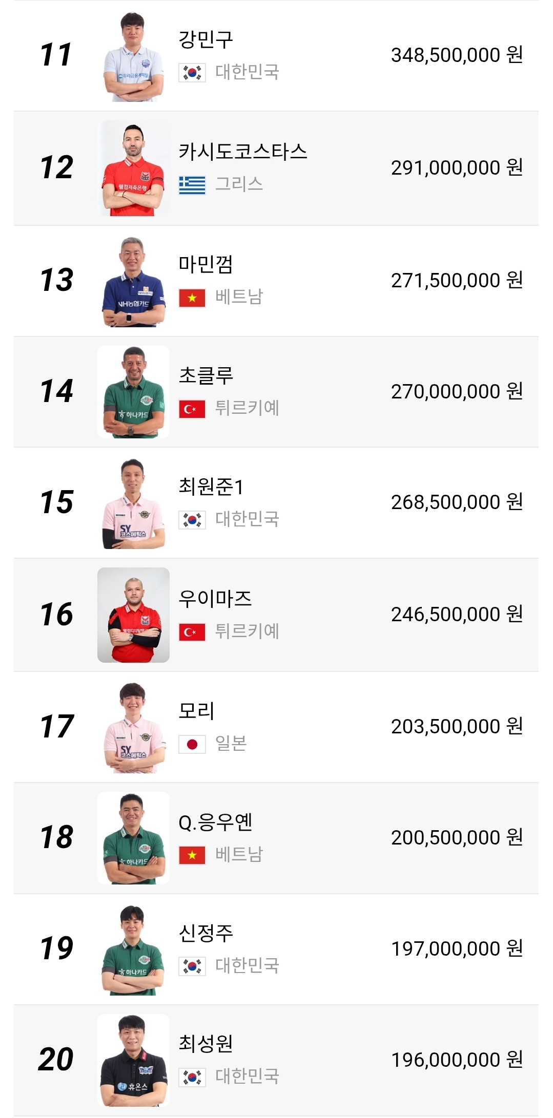 11위부터 25위권에는 강민구, 카시도코스타스, 마민껌, 초클루, 최원준, 우이마즈, 모리, Q.응우옌, 신정주, 최성원, 서현민, 엄상필, 이승진, 륏피 체네트, 김재근 등이 포진해 있습니다. 이 구간은 한 시즌 결과에 따라 TOP10 진입 가능성과 중위권 하락 가능성이 동시에 열려 있는 자리라서 매 시즌 변동 폭이 큽니다.
