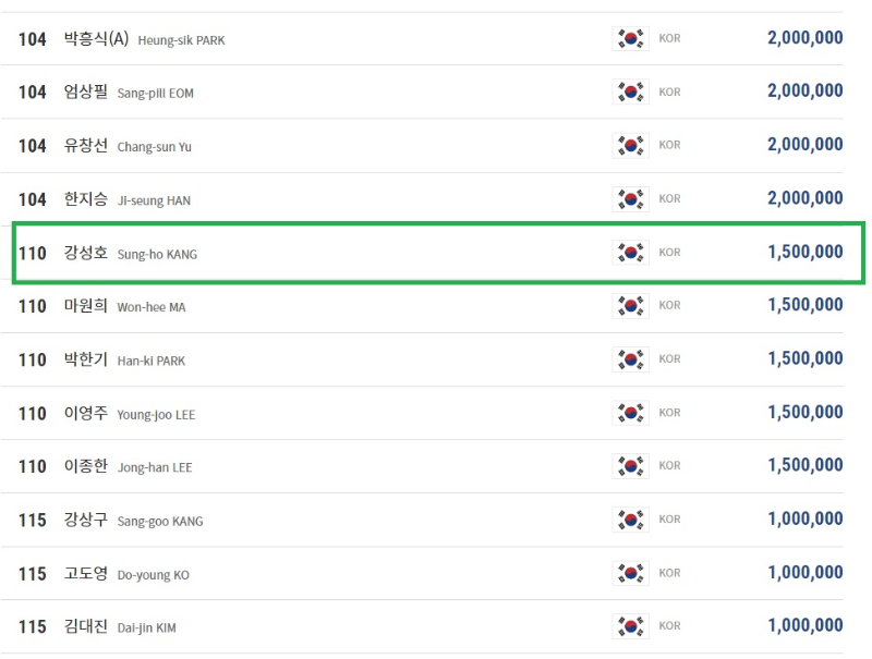 강동궁 선수 꺽고 32강 진출한 강성호 당구선수의 현재 PBA 상금 랭킹 (2023년 1월 20일 기준)