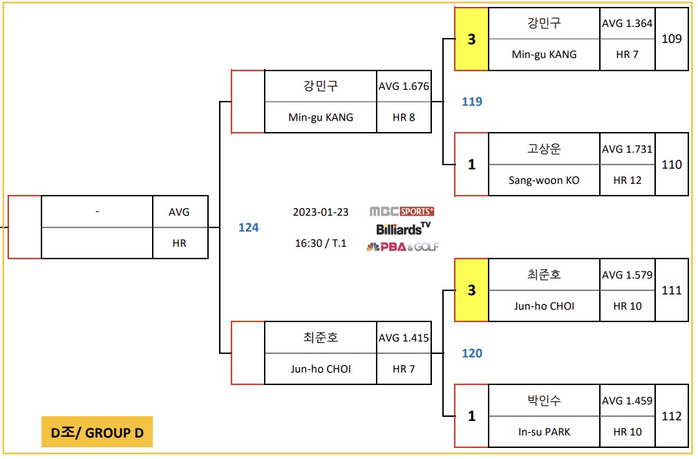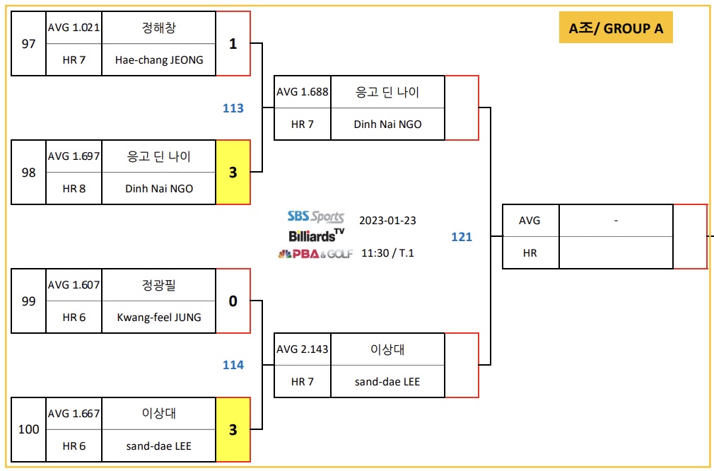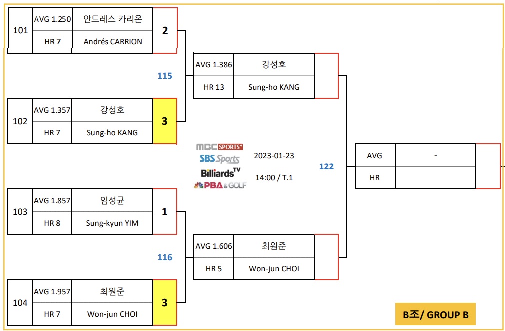| 웰컴저축은행 웰뱅 PBA 챔피언십 4강 준결승 대진표 (0) | 2023.01.23 |
