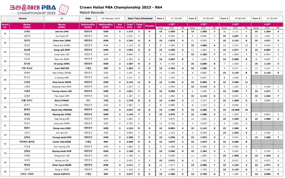 1. 크라운해태 PBA챔피언십 2023 64강 경기결과