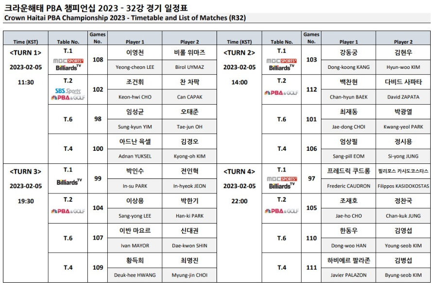 3. 크라운해태 PBA 챔피언십 2023 32강 경기 일정 중계방송 시간