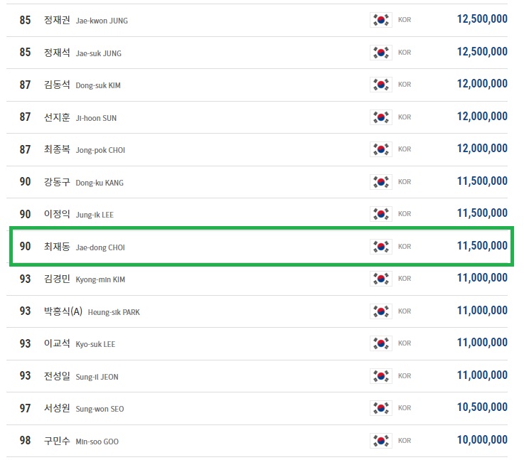 PBA 투어 프로당구 전체 시즌 최재동 당구선수의 상금 랭킹 (2023년 2월 5일 기준)