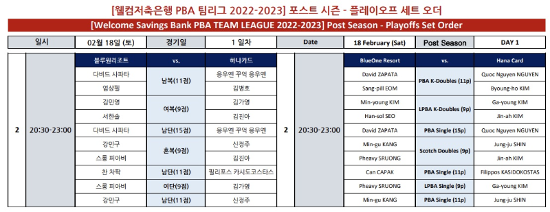 | PBA 팀리그 포스트시즌 파이널 경기 일정 - 블루원리조트 VS 웰컴저축은행 (0) | 2023.02.19 |