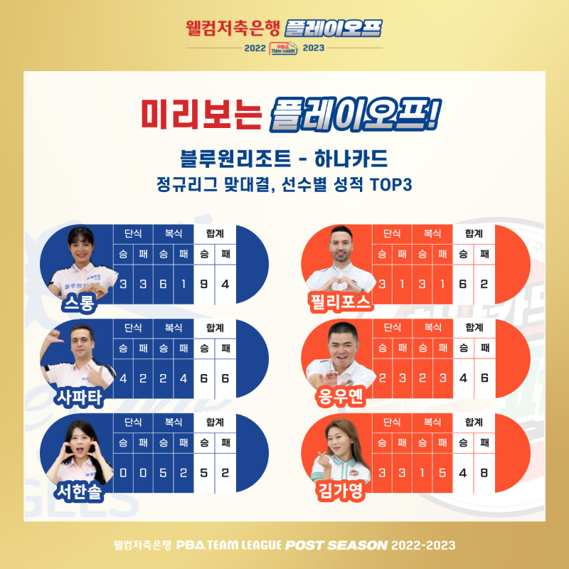 양팀 TOP3 당구선수들의 상대전적은 4:2로 블루원리조트 당구팀이 우세합니다. 하지만 웰컴저축은행 PBA TEAM LEAGUE 2022-2023 포스트시즌 플레이오프의 경기결과는 뚜껑을 열어봐야 알 수 있을 것입니다. 블루원리조트 VS 하나카드 프로당구팀의 포스트시즌 플레이오프 경기에 많은 응원바랍니다.