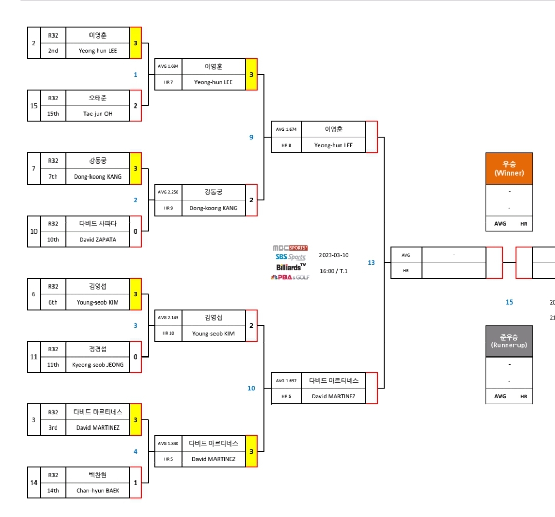| SK렌터카 PBA 월드 챔피언십 2023 결승 대진표 4강 경기결과 (0) | 2023.03.11 |