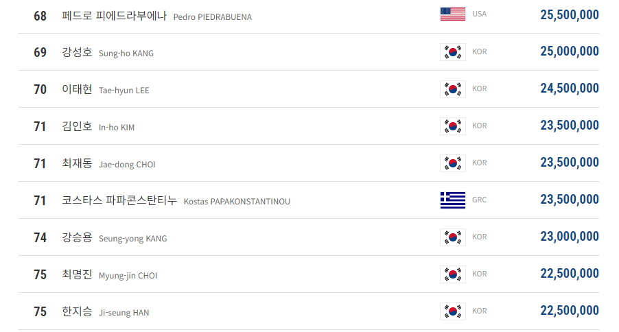 [Sports/PBA-LPBA투어] - 남자 당구선수 PBA투어 상금 랭킹 순위