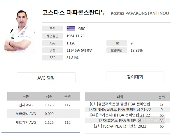 프로당구 PBA투어에 출전하는 코스타스 파파콘스탄티누는 그리스 국적의 외국인 프로당구선수입니다. 당구 중계방송 중 해설자의 컨멘트에 따르면, 코스타스 파파콘스탄티누 당구선수는 프로당구 PBA투어 초대챔피언 필리포스 카시도코스타스의 3구당구(=3쿠션=스리쿠션) 스승으로 알려져 있습니다. 오늘은 코스타스 파파콘스탄티누 당구 선수의 프로필 나이 국적과 PBA경기 상금랭킹과 주요 대회 성적에 대하여 정리하였습니다.