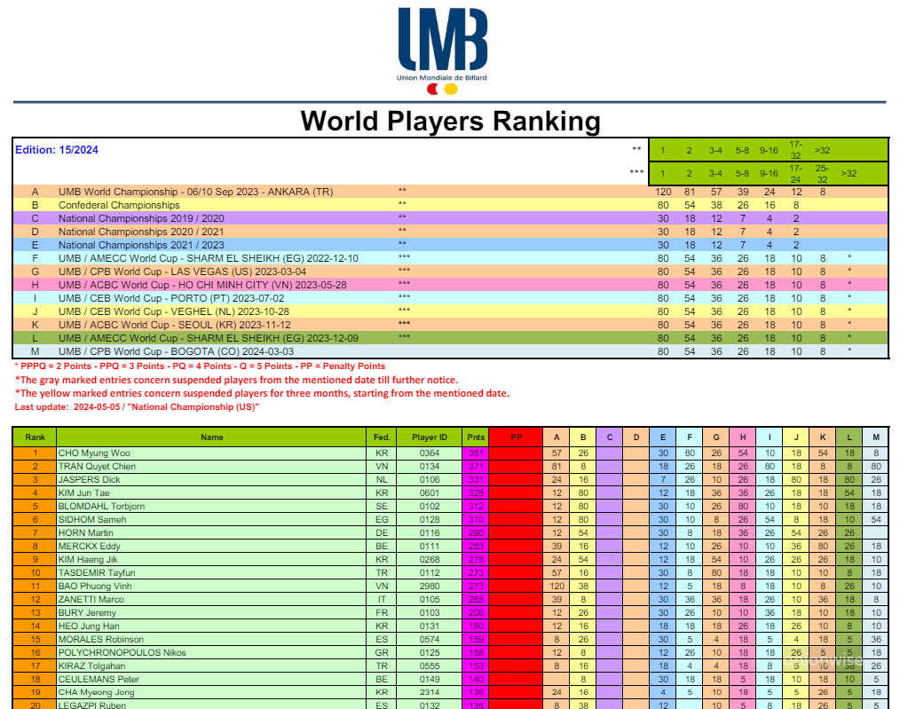 UMB는 대략 다섯 시즌 동안의 UMB 주최 당구대회 성적을 기초로 세계 당구랭킹을 평가하고 있습니다. 이번에 발표된 UMB 세계 남자 당구선수 랭킹은 과거 2019-2020시즌 국가 대항전부터 2024년 3월, 가장 최근에 끝난 보고타 세계 3쿠션 월드컵 대회 성적까지 총 13개 당구대회 성적을 포인트로 환산해서 반영하였습니다.