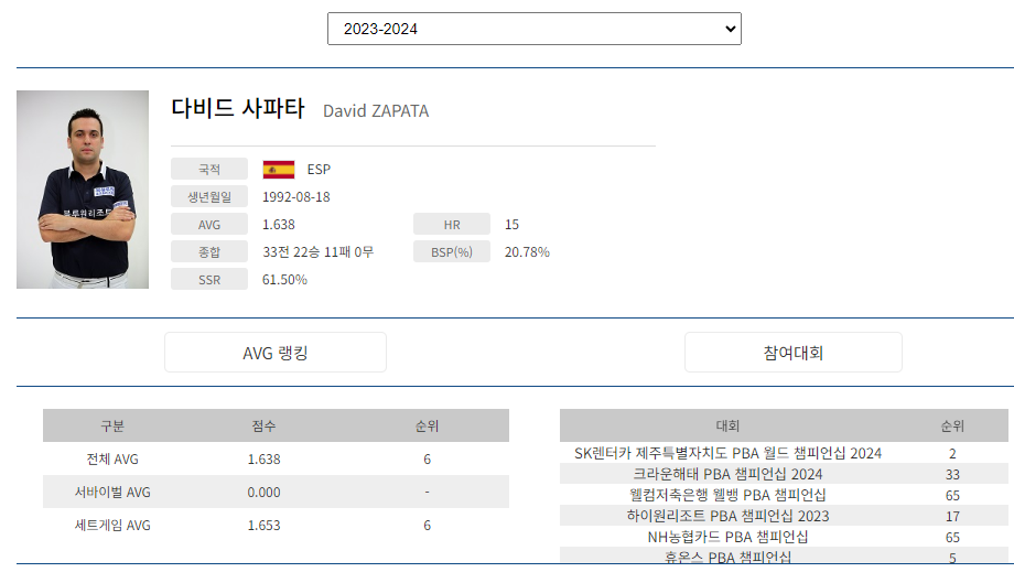 여기서 잠깐, 위의 PBA투어 남자당구 상금 랭킹 선수 순위 Top 20을 보면, 프로당구 네 시즌이 지난 현재 기준으로 스페인 당구선수, 다비드 사파타는 전체시즌에서도 2위에 올라 있는 것을 알 수 있습니다. 1992년생의 젊은 나이인 만큼 앞으로 오랫동안 PBA 프로당구 무대에서 좋은 성적을 낼 것으로 기대가 되는 선수입니다.