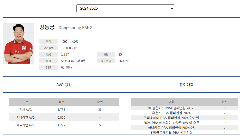 이 페이지는 PBA 프로당구협회가 주관/주최하는 남자 프로당구대회, PBA 투어에 출전하고 있는 강동궁 당구선수의 PBA투어 경기 3쿠션 에버리지, 하이런, 상금 랭킹 선수 순위, 뱅크샷 득점비율 BSP(%), 종합전적 등 당구와 관련한 모든 내용을 총정리하는 강동궁 당구 데이터베이스입니다.