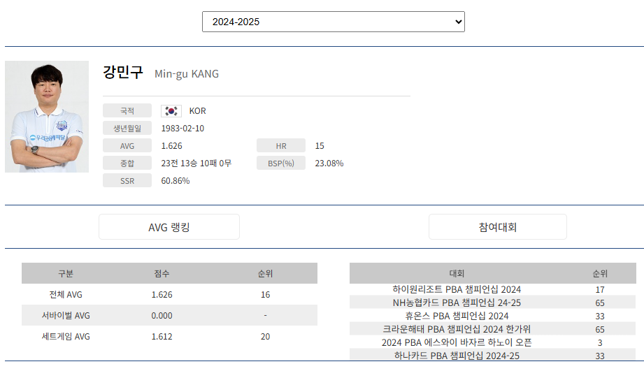 * 출처 : PBA 프로당구협회 선수정보 *참고 :경기지표는 시즌이 종료된 이후에 최종 업데이트됩니다.