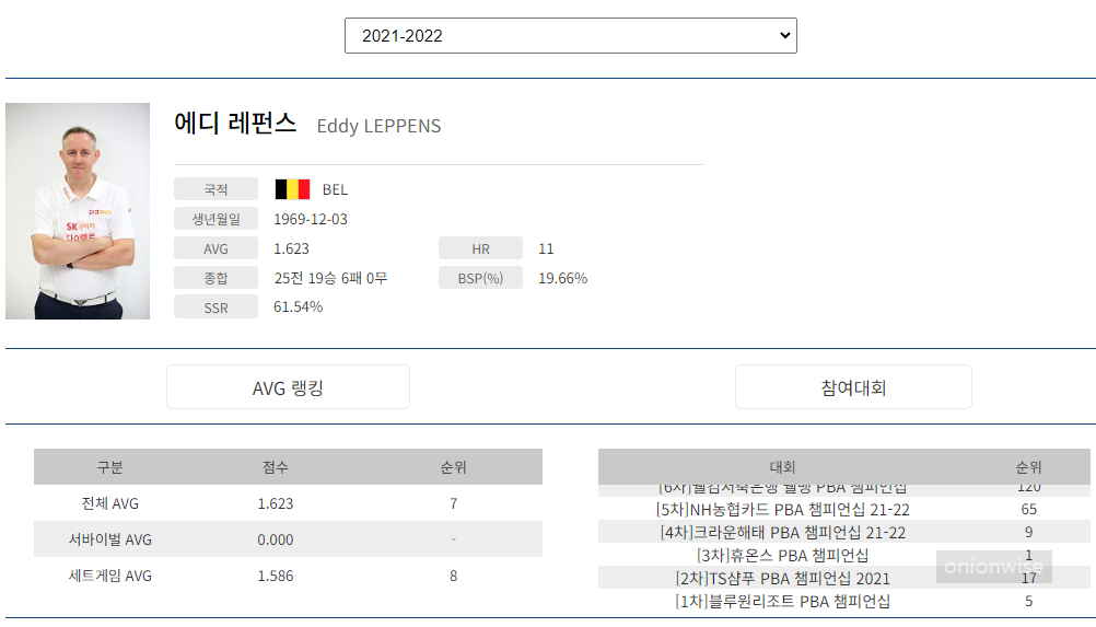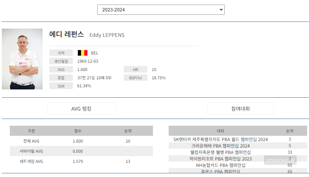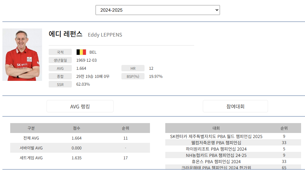 이 페이지는 PBA 프로당구협회가 주관/주최하는 남자 프로당구대회, PBA 투어에 출전하고 있는 에디 레펜스의 PBA투어 3쿠션 에버리지, 하이런, 상금 랭킹, 선수 순위, 쓰리쿠션 뱅크샷 득점비율 BSP(%), 종합전적, 우승횟수 등 당구 지표를 총정리하는 에디 레펜스 당구선수 데이터베이스입니다.