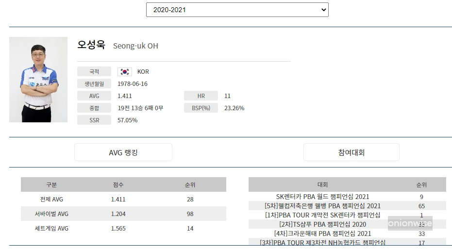 - 당구선수 오성욱의 PBA투어 에버리지, 하이런, 뱅크샷 비율(%), 종합전적, 상금랭킹