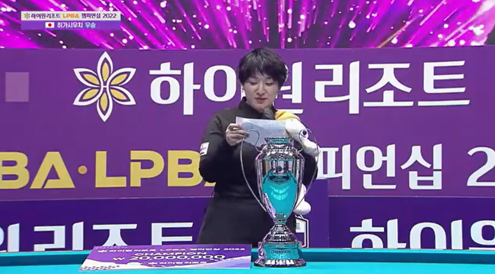 "히가시우치 나츠미 선수, 겁나게 잘 칩니다. 뱅크샷이 기가 막히네요. LPBA 챔피언의 실력입니다. 우승 축하드립니다. 히가시우치 선수."