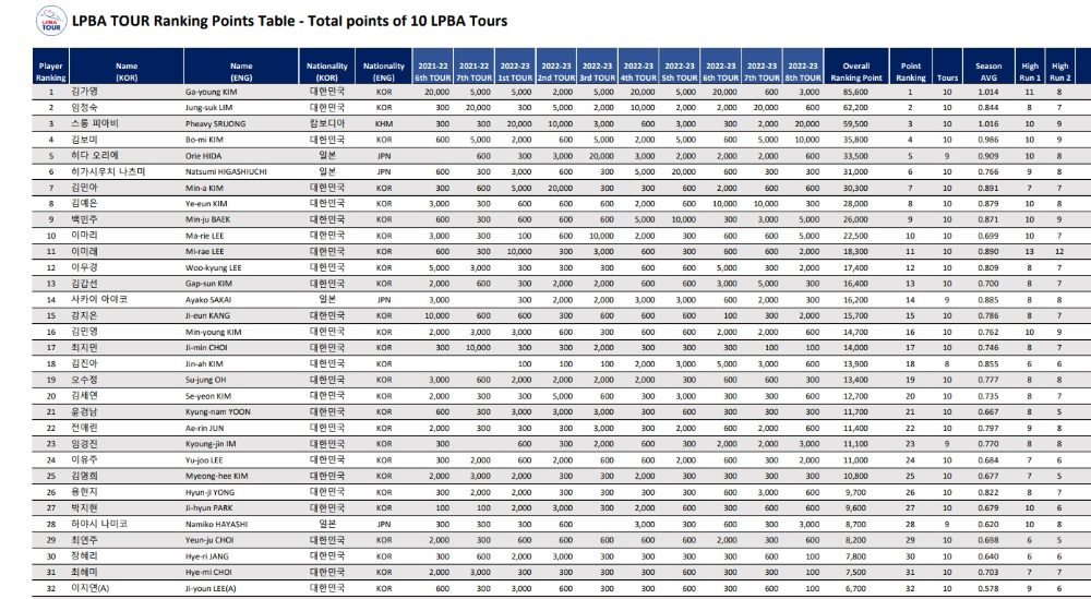 1. (국영문) 2022-23시즌 LPBA TOUR 합산 포인트 랭킹표(10개 대회)