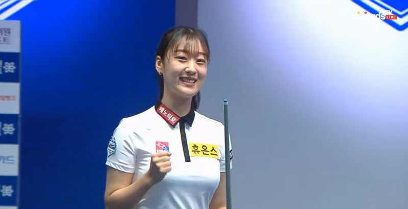 승리가 확정되는 순간, 장가연 당구선수는 두 주먹을 불끈 쥐었습니다.