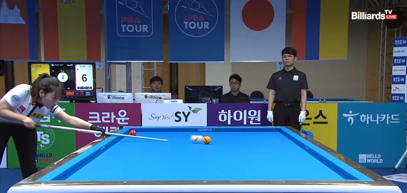 앞으로 2점만 더 득점하면 승리입니다. 3세트 6이닝까지 강지은 당구선수와의 득점차는 5점으로 다소 여유가 있지만 언제 강지은의 하이런이 터질지 모르는 상황이라 긴장을 놓을 수 없습니다.