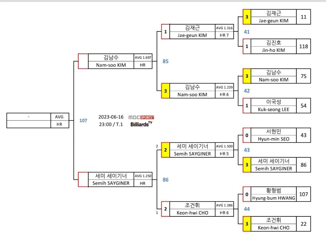그런 세미 세이기너 당구선수가 경주 블루원리조트 PBA 챔피언십 32강 대진표에서 만나는 상대선수는 김진호 당구선수와 김재근 당구선수를 이기고 올라온 김남수 선수입니다.