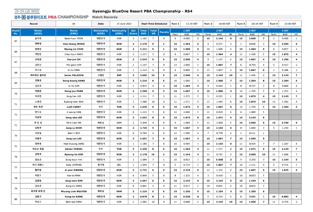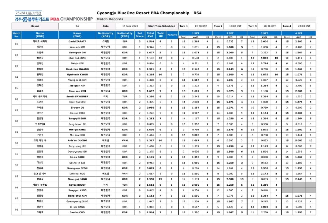 | 경주 블루원리조트 PBA 챔피언십 23-24 16강 대진표 - 32강 경기결과 (0) | 2023.06.17 |