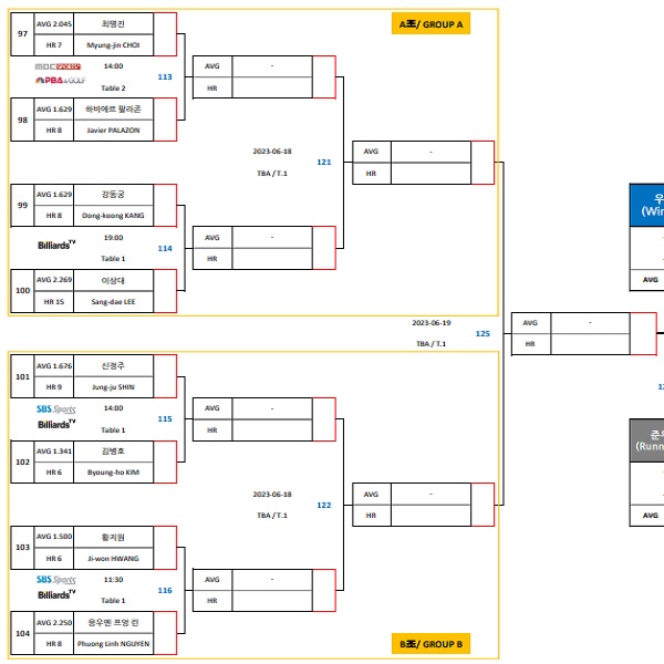 | 세미 세이기너 vs 박남수 경주 블루원리조트 PBA 32강 대진표 (2) | 2023.06.16 |