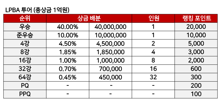 또한 이전의 LPBA투어 대회에서는 주어지지 않았던 32강 이하 순위자에게도 소정의 상금이 주어졌습니다. 32강 상금은 30만원으로 64강 상금은 15만원으로 정해졌습니다.