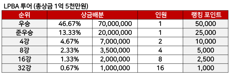 LPBA투어는 현재 3쿠션 여자당구대회 가운데 가장 많은 상금을 주는 대회로 매 대회마다 여자당구우승상금은 조금씩 증가하고 있습니다.