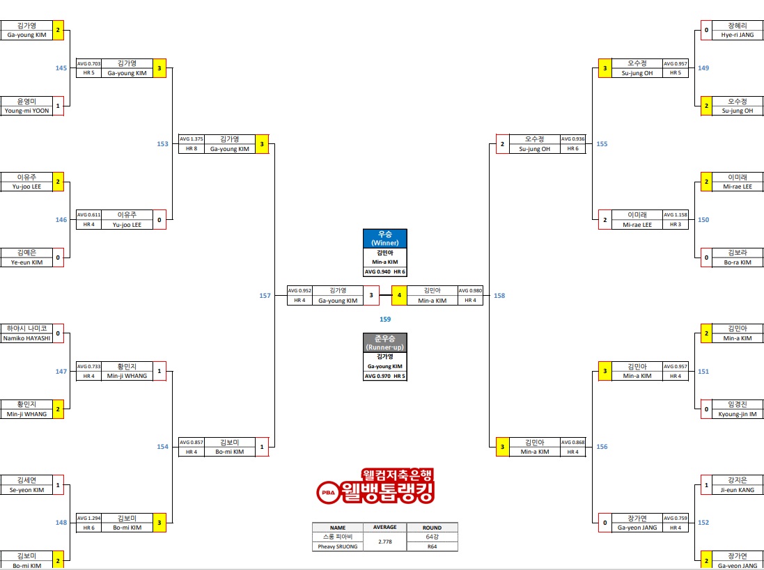 두 선수 모두 수고하셨습니다. 두번째 LPBA 우승을 차지한 김민아 선수 축하드립니다. 지난시즌 스롱 피아비를 이기고 우승한데 이어서, 올 시즌에는 개막전 결승에서 김가영 선수를 이기고 우승차지했습니다. 이제는 김민아의 당구 시대가 열리려나 봅니다. 준우승한 김가영 선수도 정말 수고하셨습니다.