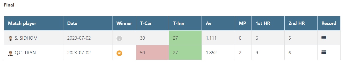 트란은 7월 3일 새벽 포르투갈 포르투 드래곤아레나에서 열린 "2023 포르투 3쿠션 월드컵" 결승전서 사메 시돔(8위, 이집트)을 상대로 27이닝만에 50:30으로 낙승을 거두었습니다.