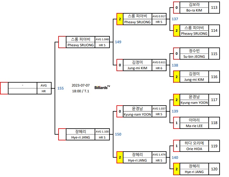 스롱 피아비의 리벤지가 될 것인지, 아니면 장혜리 선수가 다시 한번 괴력을 보여 줄 것인지 기대가 됩니다. 제가 특별히 관심을 더 갖는 경기도 바로 이 스롱 피아비 장혜리 8강전입니다. 8강전 경기결과만 보면 스롱 피아비 선수의 에버리지가 1.048로 상당히 높은 편이지만, 장혜리 선수의 에버리지는 1.100으로 좀 더 높습니다.