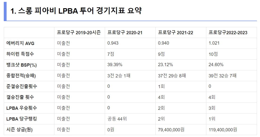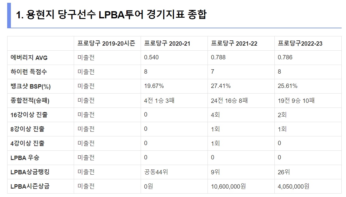 ☞ 용현지 당구선수 LPBA 경기지표 종합